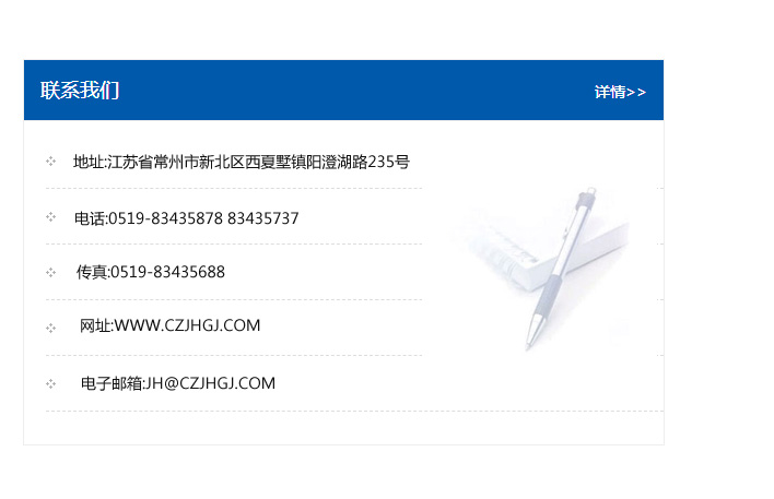 地址:常州市新北區友邦商務大廈1幢16、17層  電話:0519-85101652  傳真:0519-85112595  郵編:213022  網址:www_cz-jiayue_cn.njhdjd.com  郵箱:xiajifengaa@163.com